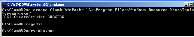 sc create ClamD binPath= C:\Program Files\Windows Resource Kits\Tools\srvany.exe(yes, the space is required in this command, and you may have your resource tools in a different location)
