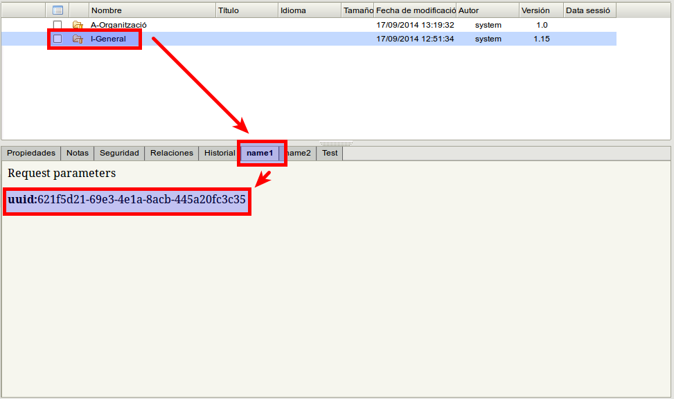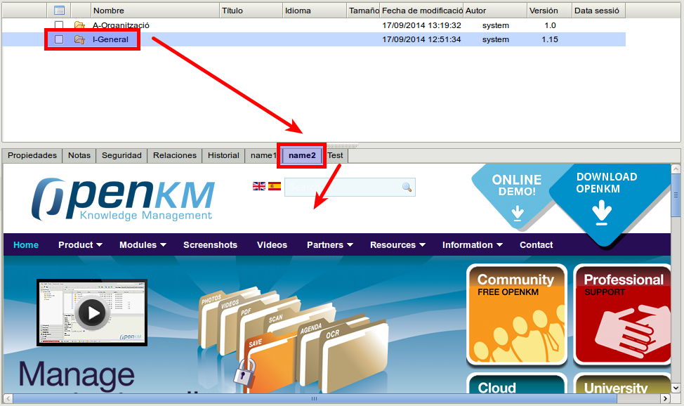Each row is a pair of values declaring tab content; the format is: name;url name1;http://localhost:8180/openkm/test.jsp |