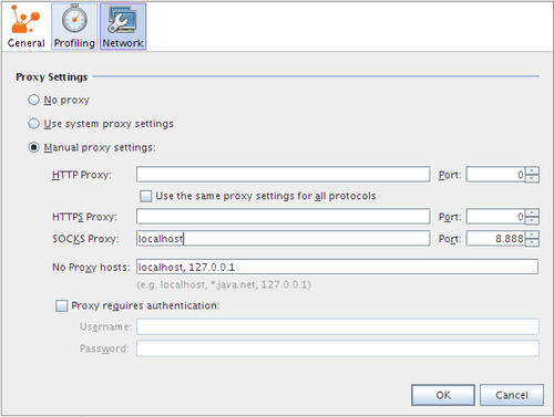 Configure VisualVM to use this proxy. Go to Tools > Options > Network and edit Manual Proxy Settings. Configure the SOCKS proxy at localhost and port 8888.