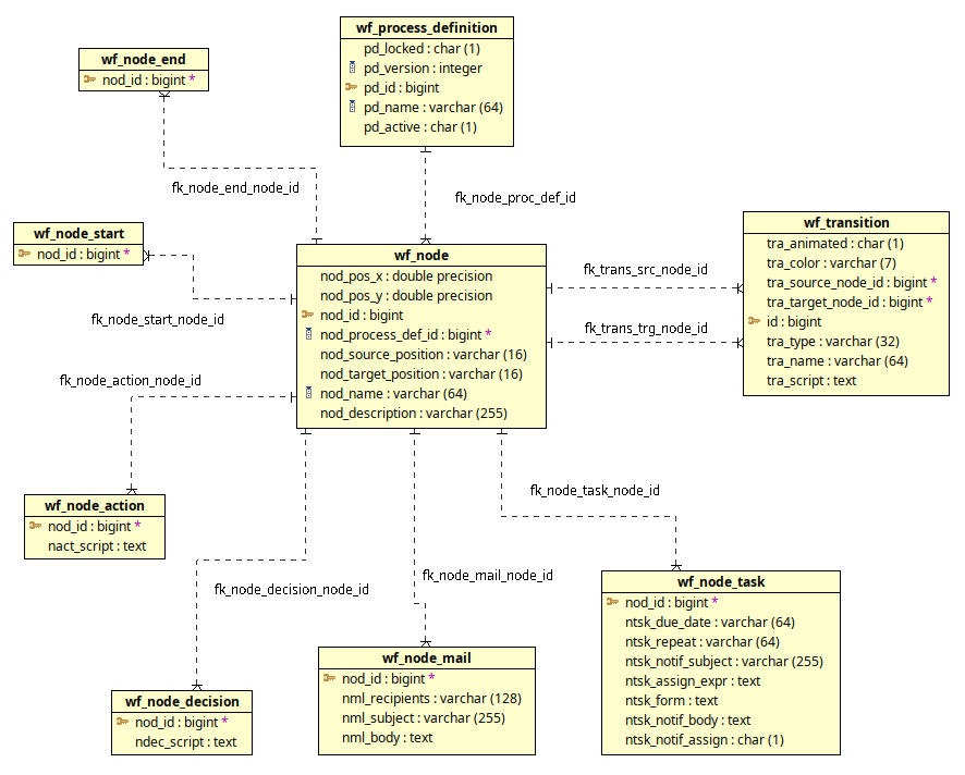 - WF_NODE → Specialized Node Tables: JOINED inheritance relationship. Each node type (Start, End, Action, Decision, Mail, Task) extends the base WF_NODE table through a foreign key join.