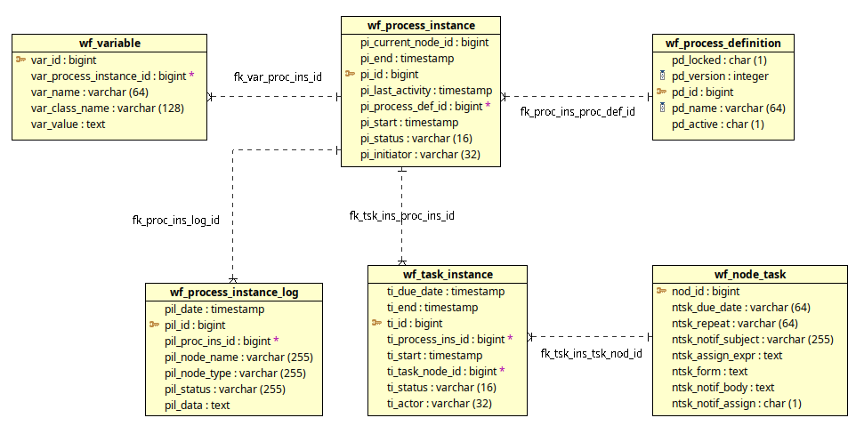 - WF_PROCESS_INSTANCE → WF_VARIABLE: One-to-many relationship. Each process instance maintains its own set of variables.